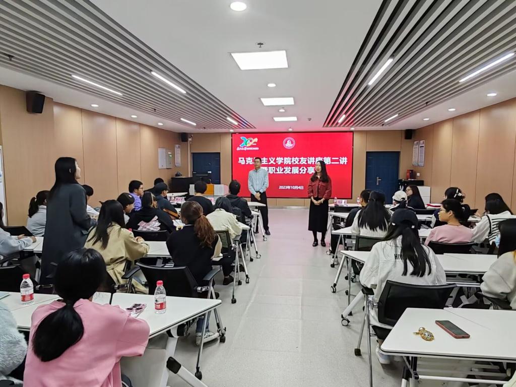 在随后开展的员工职业发展分享会上,吴云英畅谈了自己多年来在上海实习、就业、创业的成长感悟,并结合自身职业发展经历给同学们提出三点建议:一是要抓住机会,敢于去试、大胆去闯,大方自信地展示自己;二是要树立“利他”思维,帮助他人的同时帮助自己;三是要坚信“向外求得烦恼,向内求得幸福”,注重自身品德修养。她还结合典型案例分享了人际交往和求职面试技巧。育山(上海)教育科技有限公司总经理文伟员工聚焦“梦想、兴趣、动力”三个关键词讲述其创业体会,鼓励同学们培养兴趣、追求梦想、打造核心竞争力,在求学、求偶、求职过程中坚信“每天进步一点点,就能成为更好的自己”。在总结发言中,汤慧珍将两位员工的精彩分享浓缩为一个公式,即梦想+善学+修德=成功;她勉励同学们以学长学姐为榜样,志存高远、苦练本领、超越自我,学有所成,为公司增光、为人生添彩。