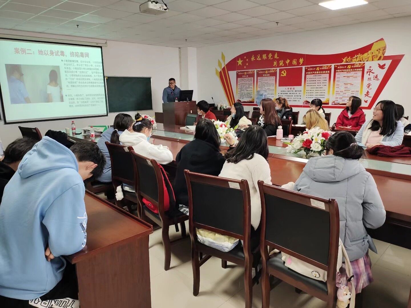 在宣讲前,文老师为同学们介绍了老员工安全教育类别,随后他帮助同学们明确了什么是毒品,并分析了当代社会上发生的数起毒品案例,使同学们更加认识到毒品的危害性,它会磨灭人的意志、毁坏人的前途。随后他进一步分析了老员工接触毒品的诱因,引导大家思考如何拒绝毒品,保护自己。