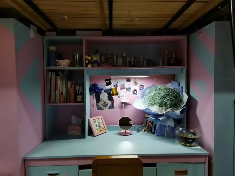 继续走进去深入探索也是惊喜连连,同学们把不大的寝室装饰的充满生活气息和人情味,行李多而不乱,寝室空气清新怡人,夹杂着淡淡的清香浸人心脾;屋顶有气球装饰、贴纸装饰和灯光装饰;墙壁被划分了绘画墙、照片墙、安全墙和留言墙等区域;桌面床铺有玩偶、鲜花、收藏品和时令水果装饰,搭配桌布温柔的台灯灯光使人心情愉悦,清爽又养眼;书架上摆着的《共产党宣言》《习近平谈治国理政》满满都是永利集团3044的浓厚文化学术氛围。